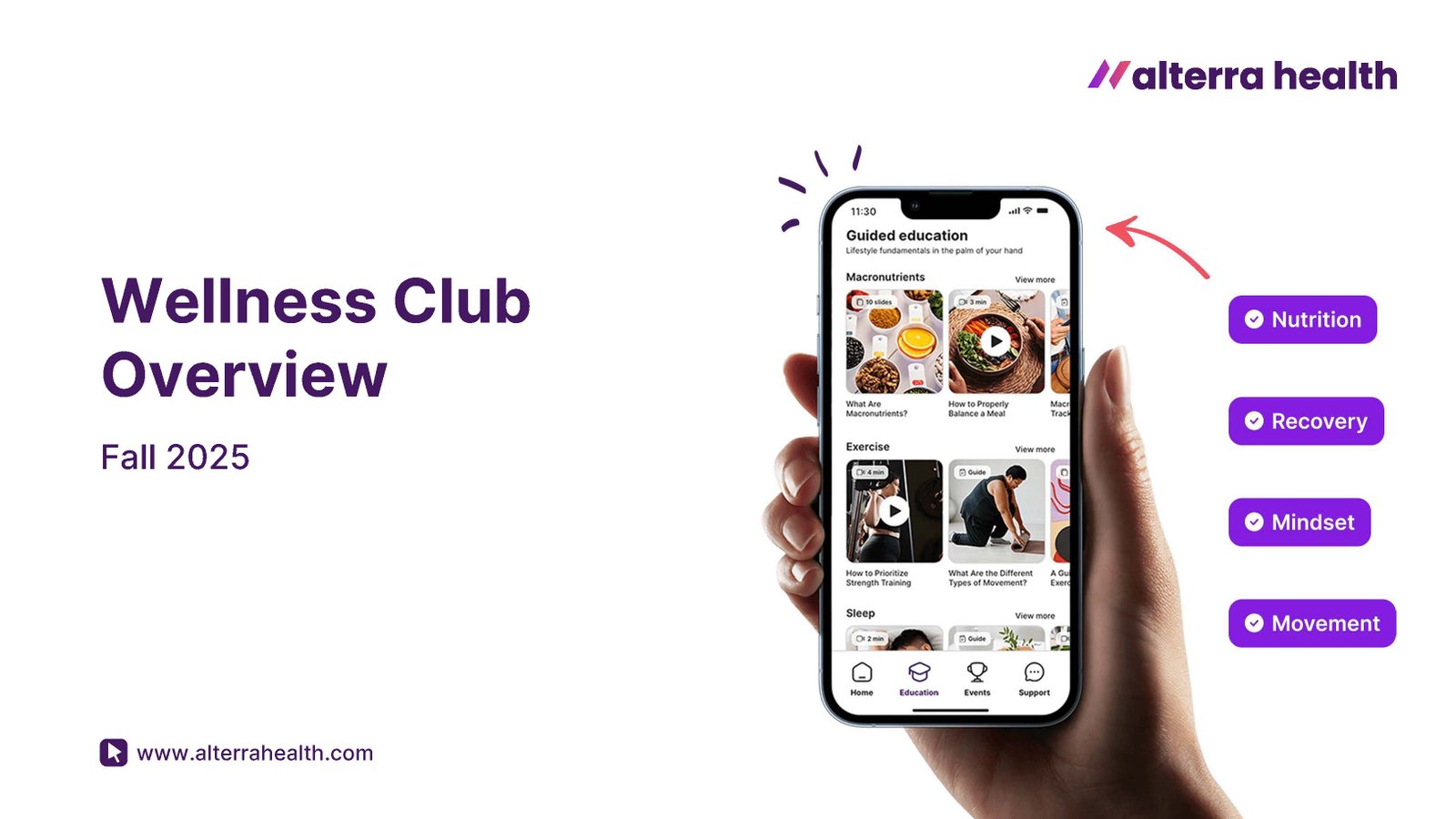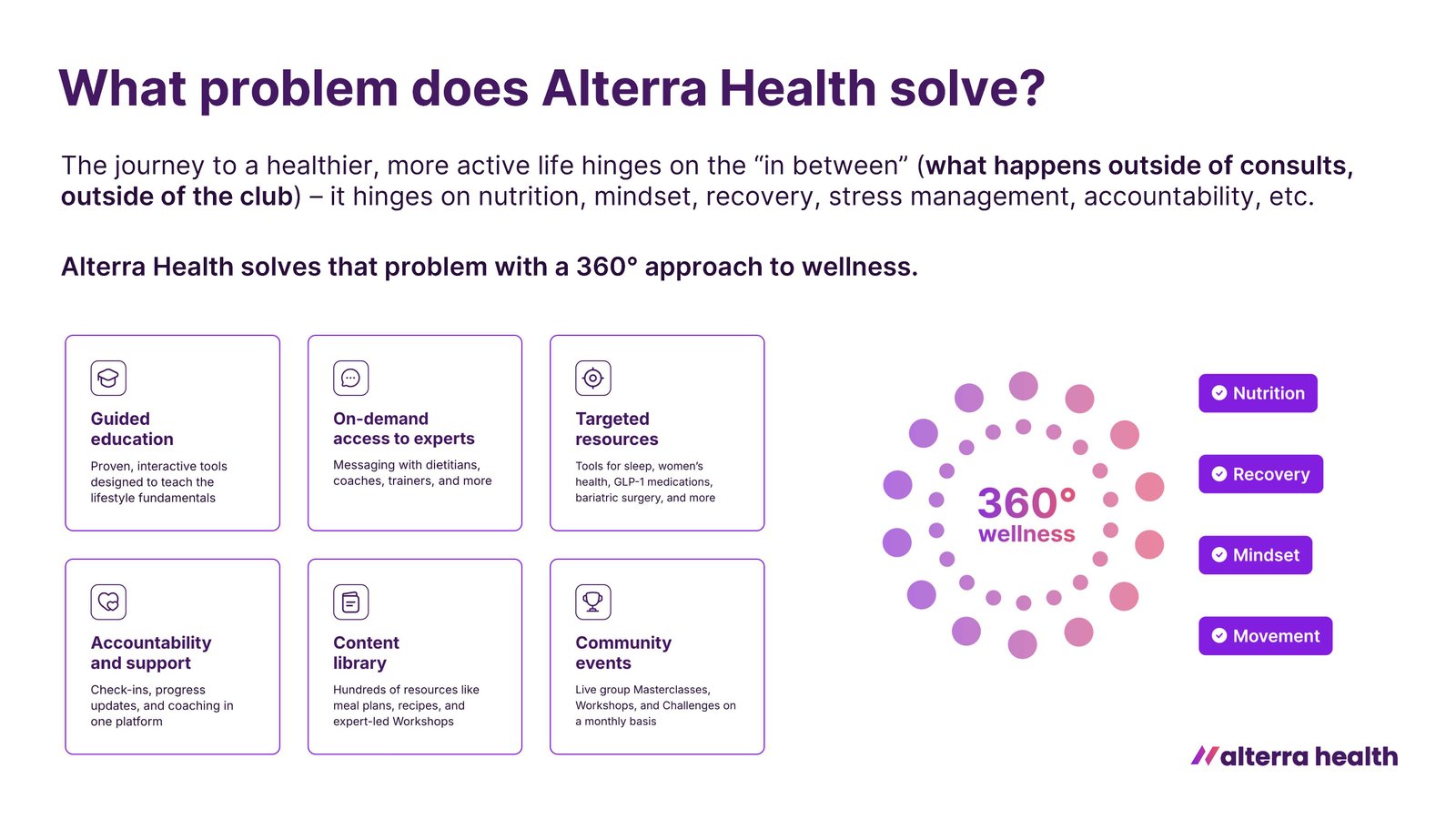 Alterra Health acts as a digital companion to your team – offering members educational tools, planning templates, expert content, and habit strategies so they stay engaged and progressing without needing constant face time.