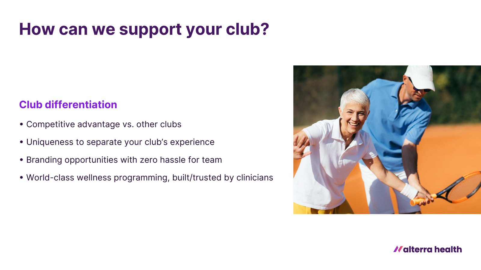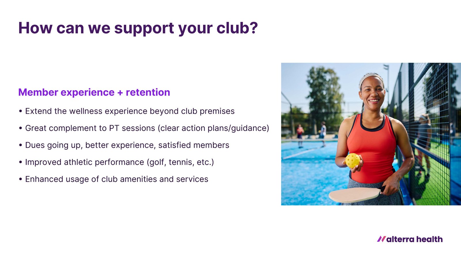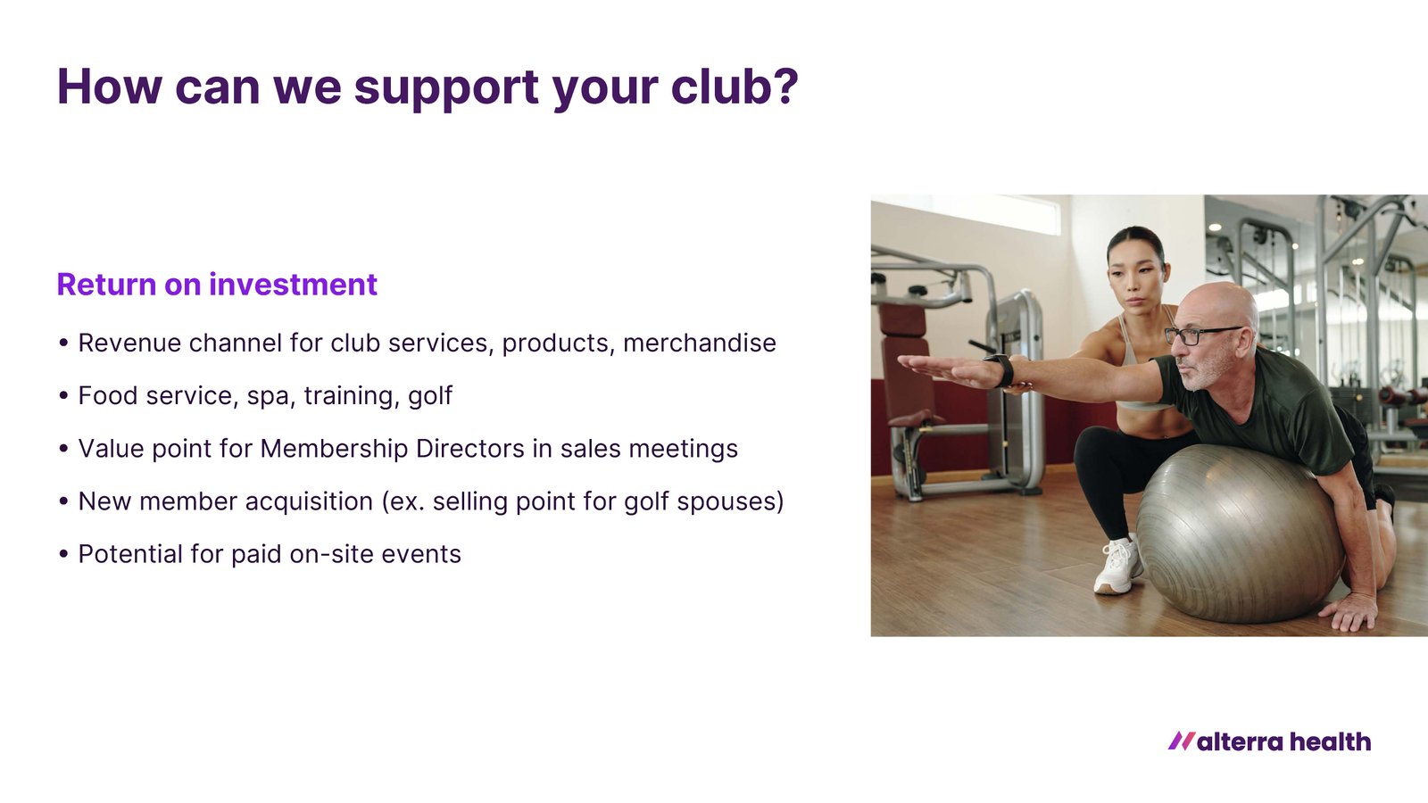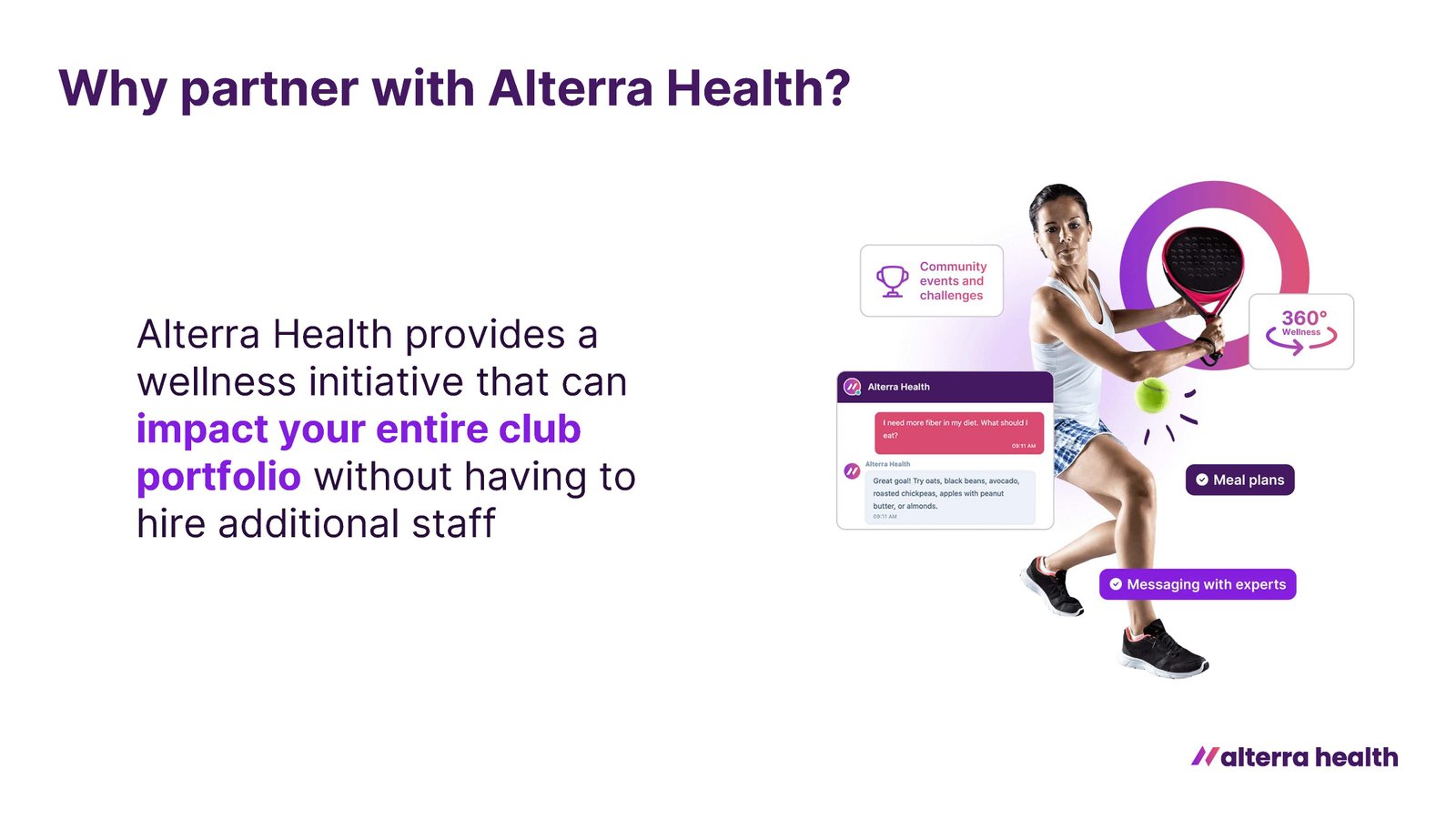 Alterra Health helps clubs enhance what they’re already doing – bringing the lifestyle full circle for members with clinically-backed support that adds value long after they leave the property.
